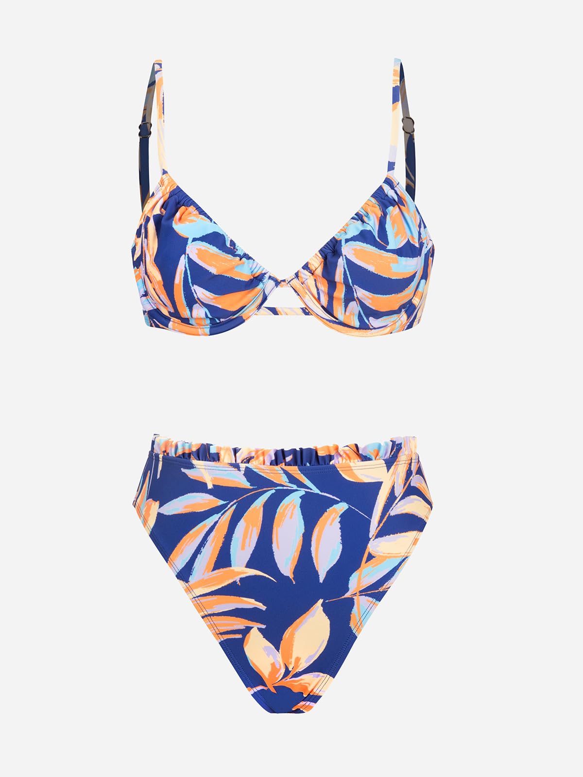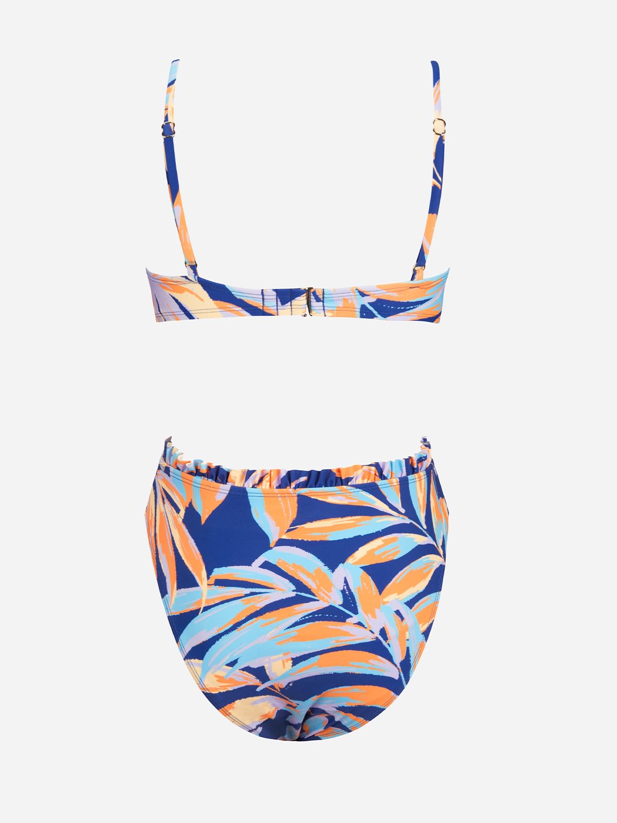 • Design: Crush on this tropical print two piece bikini set with adjustable spaghetti straps, including a triangle top with underwire and high waisted cheeky bottom piece with lettuce edge trim. About cup style: with underwire and removable pads