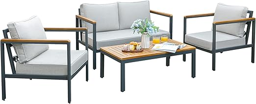 Devoko 4 Pieces Patio Furniture Sets Outdoor Conversation Set Acacia Wood Sofa Set with Coffee Table Thicker Sponge Cushion