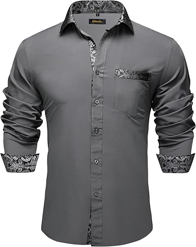 DiBanGu Mens Long Sleeve Dress Shirt Casual Cotton Button Down Shirts with Pocket Business Inner Contrast Shirt, Grey, Large
