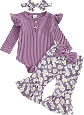 fhutpw Newborn Baby Girl Clothes Rib Frill Long Sleeve Romper Daisy Flared Pants Headband Set 3pcs Fall Winter Outfits