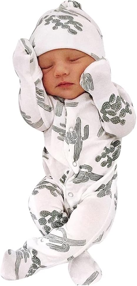 general3 Newborn Baby Boys Girls Bodysuit 2 Piece Set Infant Cactus Print Romper Jumpsuit + Hat Outfits Sets (White, 3-6 Months)