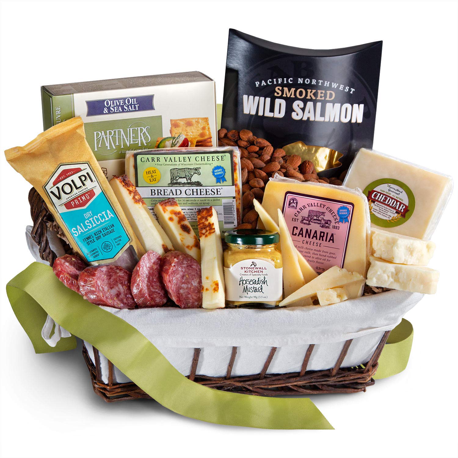 Entertainers rejoice! This selection of fresh and aged cheeses pared with perfect accompaniments of charcuterie and mustard is going to delight all the foodies on your list! Canaria - an olive oil soaked cheese that will be your new favorite, our Farmstead Gourmet Cheddar, and Bread Cheese perfect for frying. Charcuterie includes Smoked Wild Salmon and Volpi Dry Salsiccia. Add in classic sea salt crackers, roasted and salted California almonds, and horseradish mustard and you have a party! All hand packed into a woven basket.