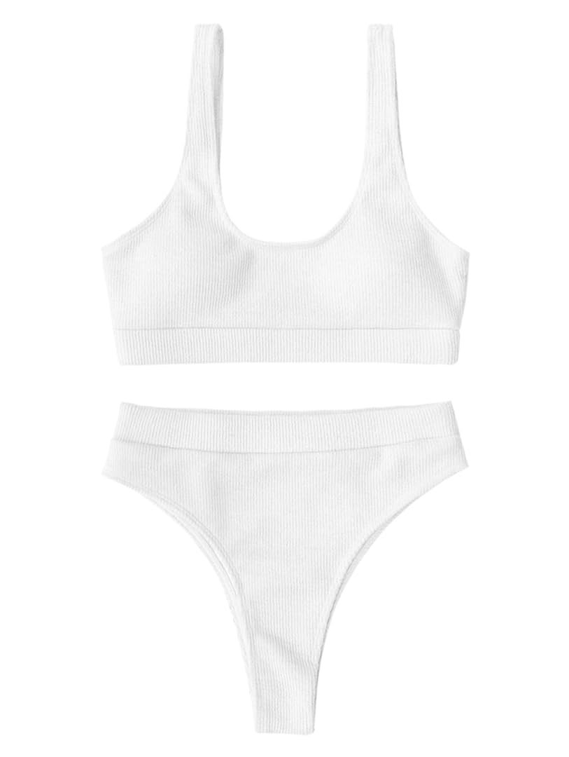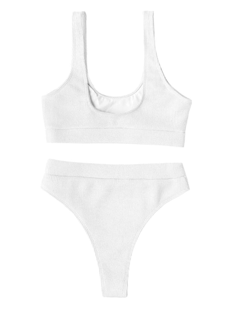 Lilosy High Waisted Tummy Control Bikini Ribbed Sporty Brazilian Swimsuit Set Women Highwaisted Cheeky Cut Leg Bottom Crop Push Up Top 2 Piece Bathing Suit Knit White Large