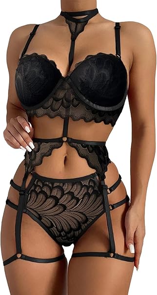 Lilosy Sexy Choker Floral Lace Scallop Sheer Underwire Push Up Garter Belt Lingerie Set for Women