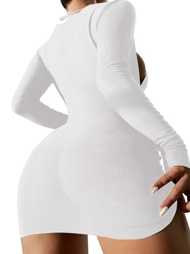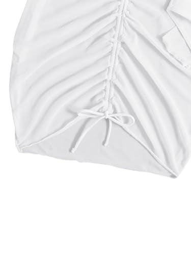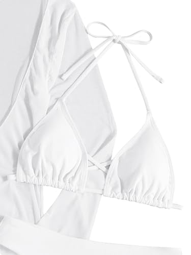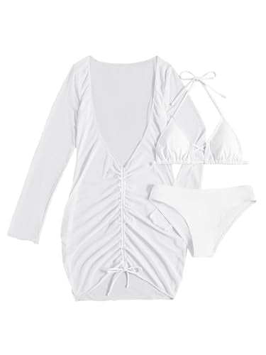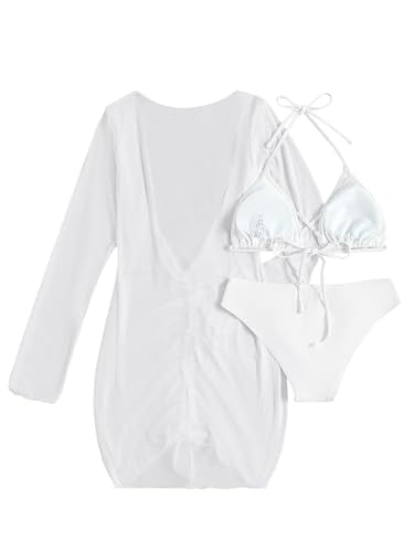 Lilosy Sexy Long Sleeve Mesh Sheer Beach Swim Cover Up Dress Bikini 3 Piece Women Drawstring Swimwear Swimsuit String Bathing Suit Set Drawstring White Large