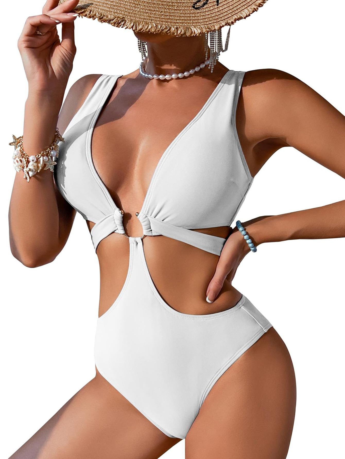 Lilosy Sexy Plunge Metal O Linked Cutout Plunge Low Cut One Piece Swimsuit High Leg Rise Cheeky Brazilian Bathing Suit Women Bikini White Medium