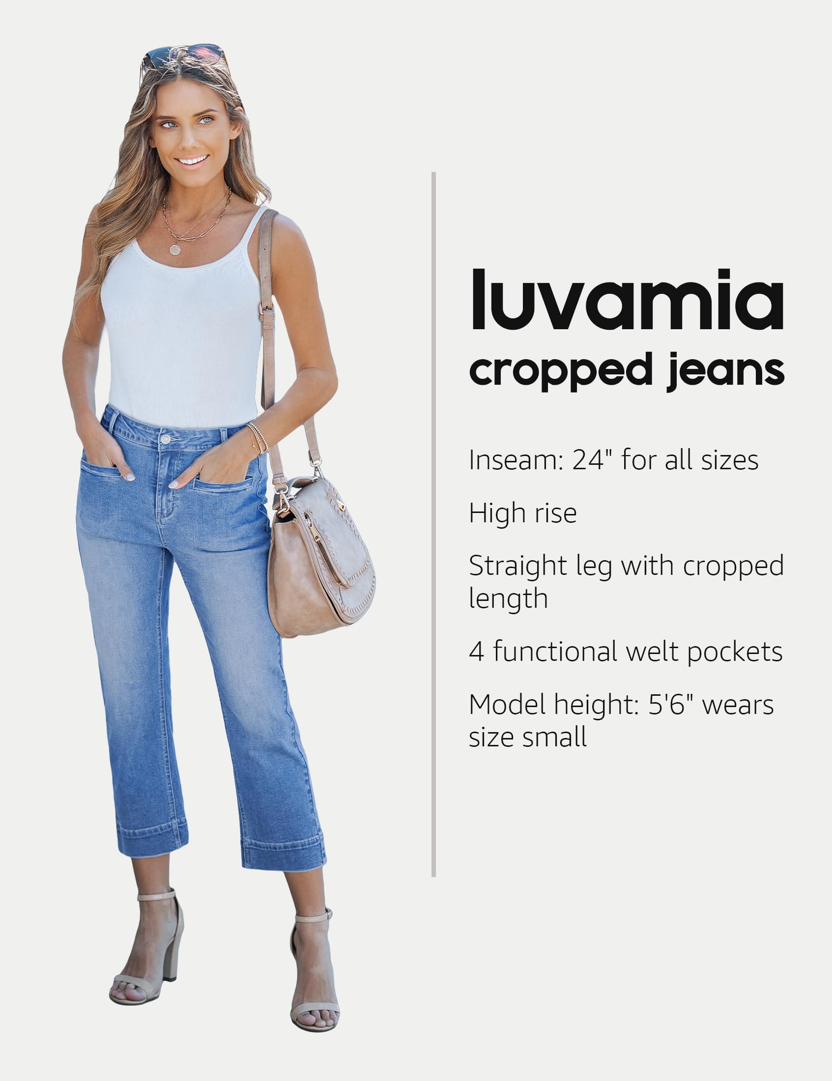 • luvamia straight leg jeans for women feature high rise, cropped length, 24 inches inseam, 2 welt pockets in the front and 2 in the back. The women's jeans size 14 are crafted from soft and stretchy fabric which is perfect for spring, summer and fall.