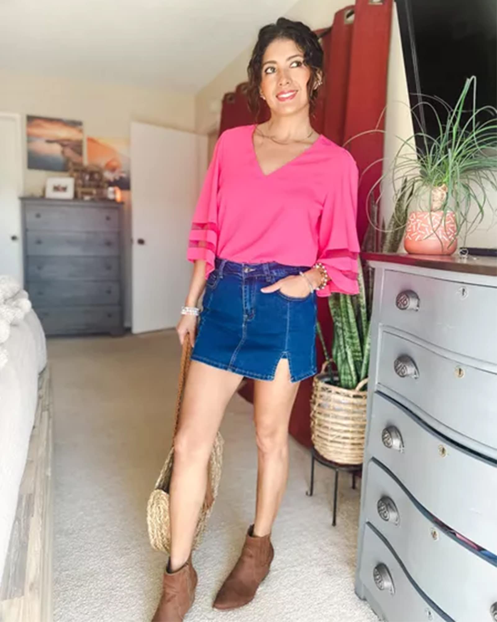 High waisted jean shorts women high waisted with slit create a throwback look for your '90s outfits wardrobe. You can style this skorts skirts for women with pockets with a floral blouse to add a femmate touch to your daily outfits.