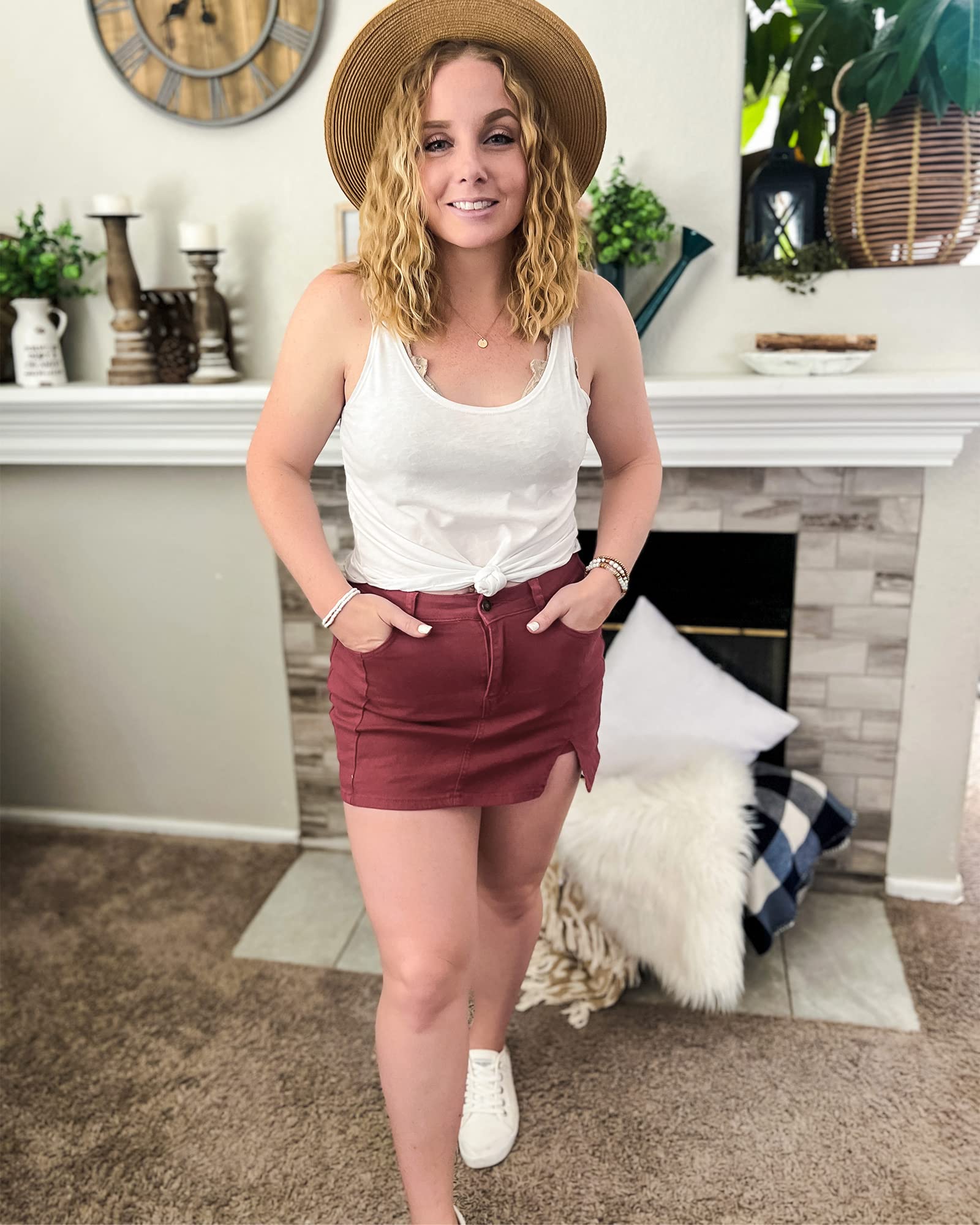 High waisted jean shorts women high waisted with slit create a throwback look for your '90s outfits wardrobe. You can style this skorts skirts for women with pockets with a floral blouse to add a femmate touch to your daily outfits.