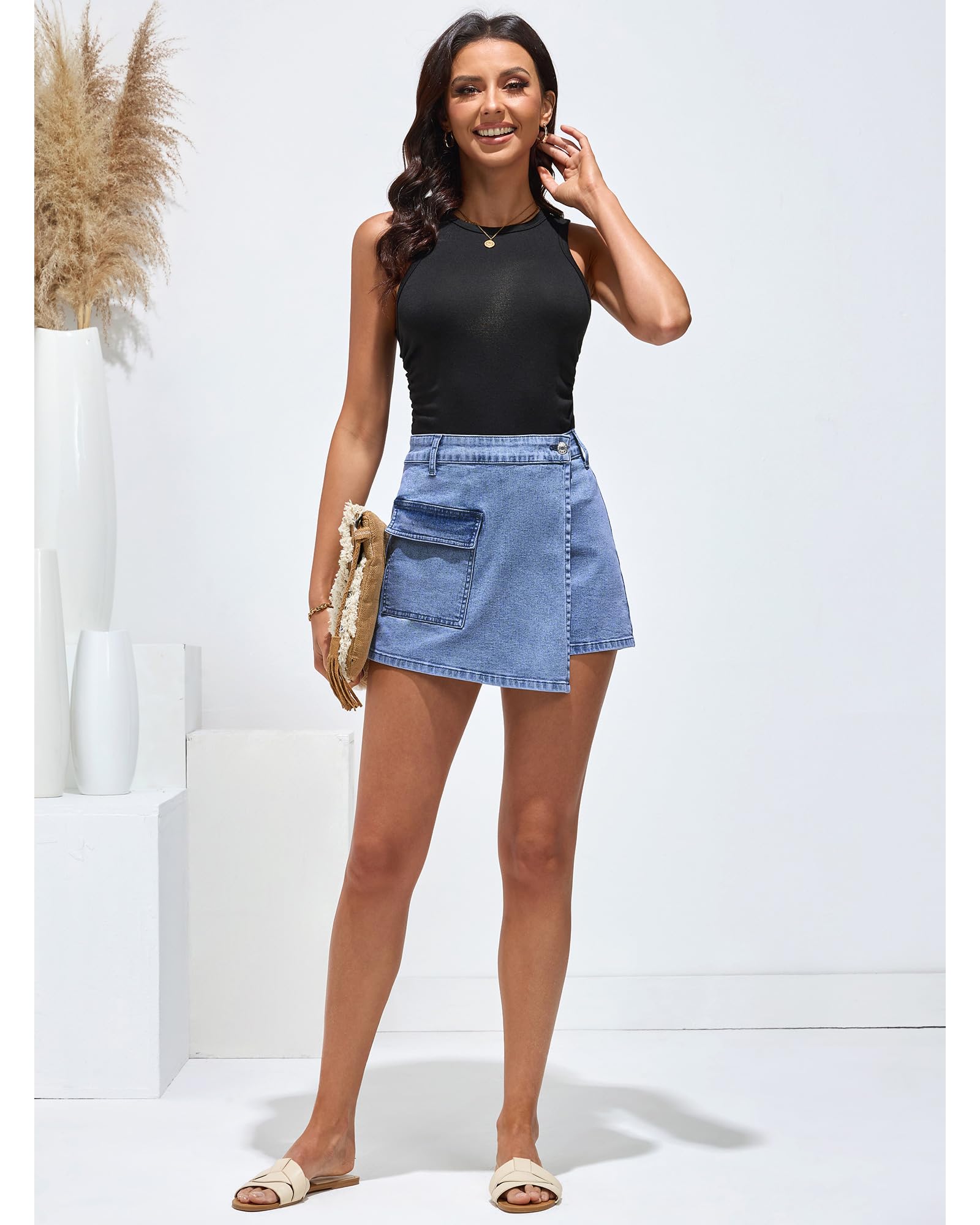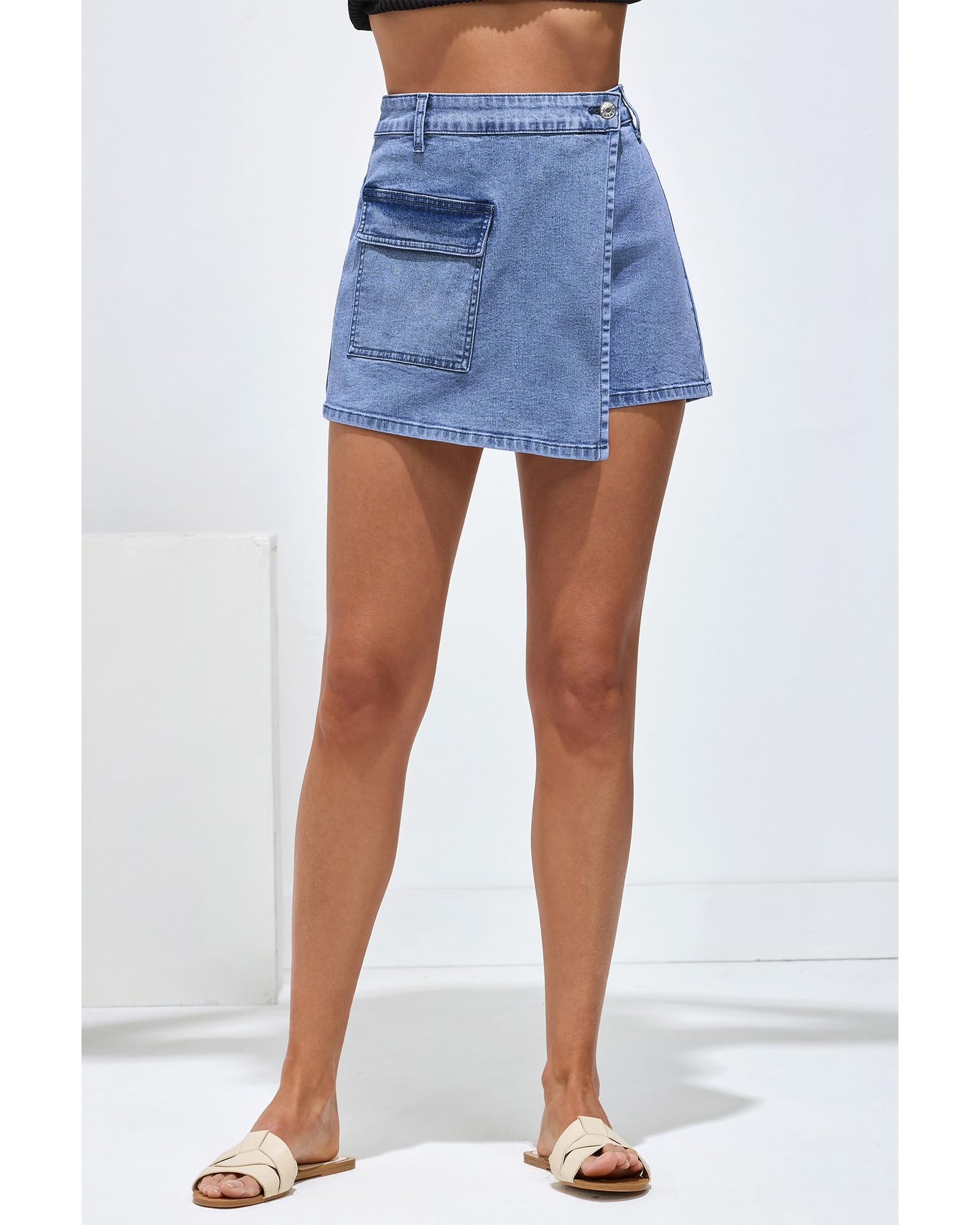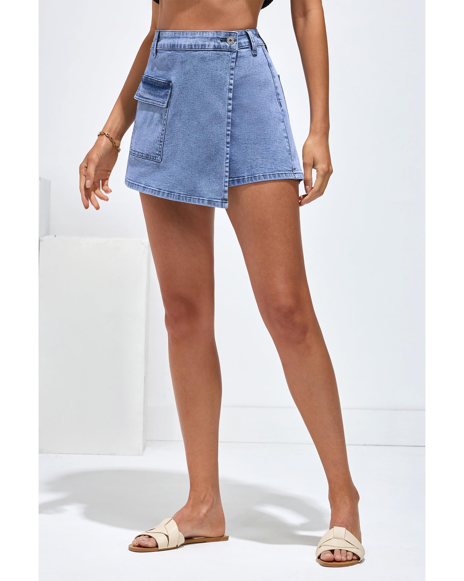 • luvamia denim skirts for women feature faux wrap design, high waisted, pockets and stretch. The high waisted design of trendy shorts for women 2024 enhances the elongation of the legs and creates a flattering silhouette by sitting above the natural waistline.