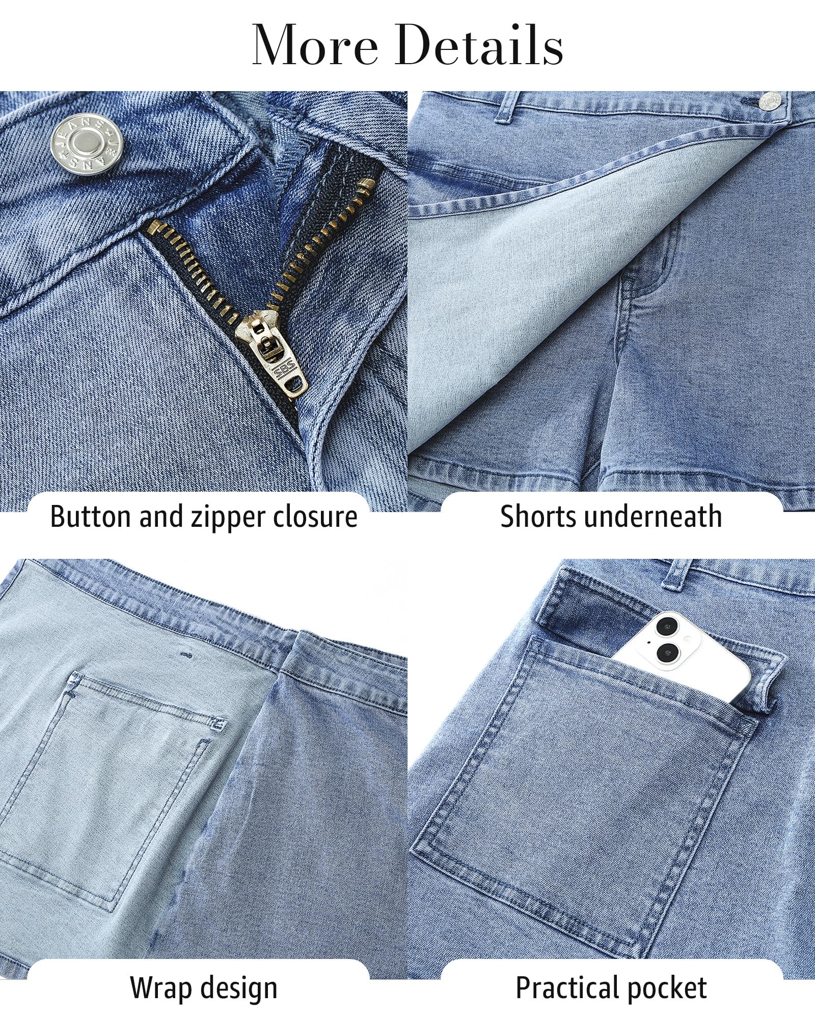 • These jean skorts have asymmetric hemline that adding visual interest and an illusion of layers. And their three practical pockets offer storage options without compromising aesthetics, allowing for convenient access to essentials.