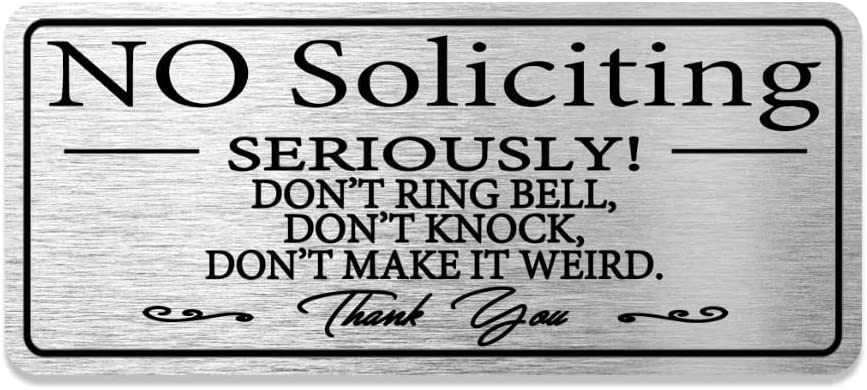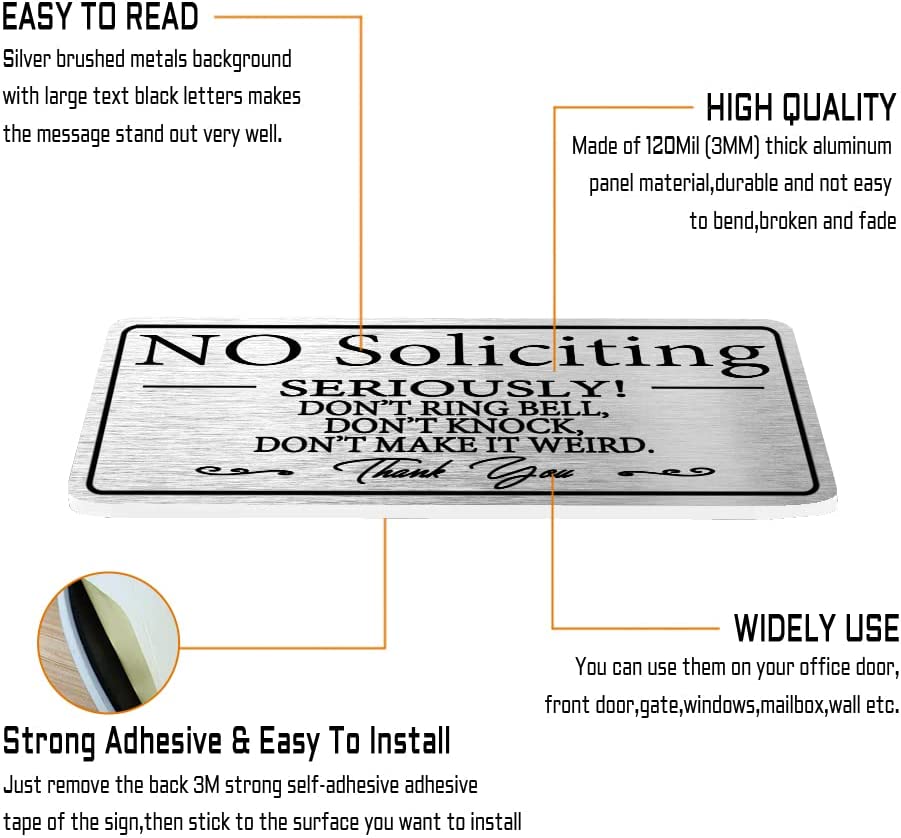 • ✔ Keep Unwanted Visitors Away - The no soliciting sign helps prevent all sorts of strangers knocking at the door, keeping the annoying solicitors away. A Polite Way of Saying No - It has the polite "Thank you" under the No Soliciting message. A nice subtle way of saying no thanks. Keeps unwanted visitors off your front porch.