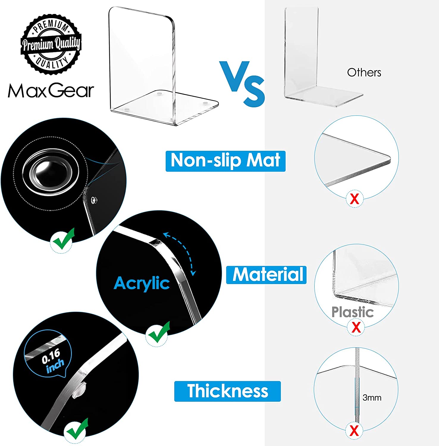 MaxGear Bookends Acrylic Book Ends Clear Book Ends for Shelves Decorative bookends for Shelves Non-Skid Book End Heavy Duty Bookend Book Holders for Shelves Book Stoppers (2 Pairs/4 Pieces, Large)