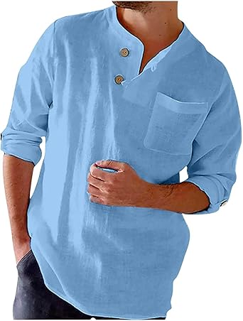 Men's Cotton Linen Henley Shirt Long Sleeve Band Collar Hippie Casual Beach T Shirts Breathable Regular Fit Tees