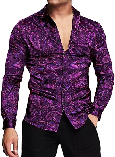 Men's Silk Satin Luxury Paisley Shirts, Button Up Long Sleeve Shirt for Formal/Leisure Wedding Party Prom