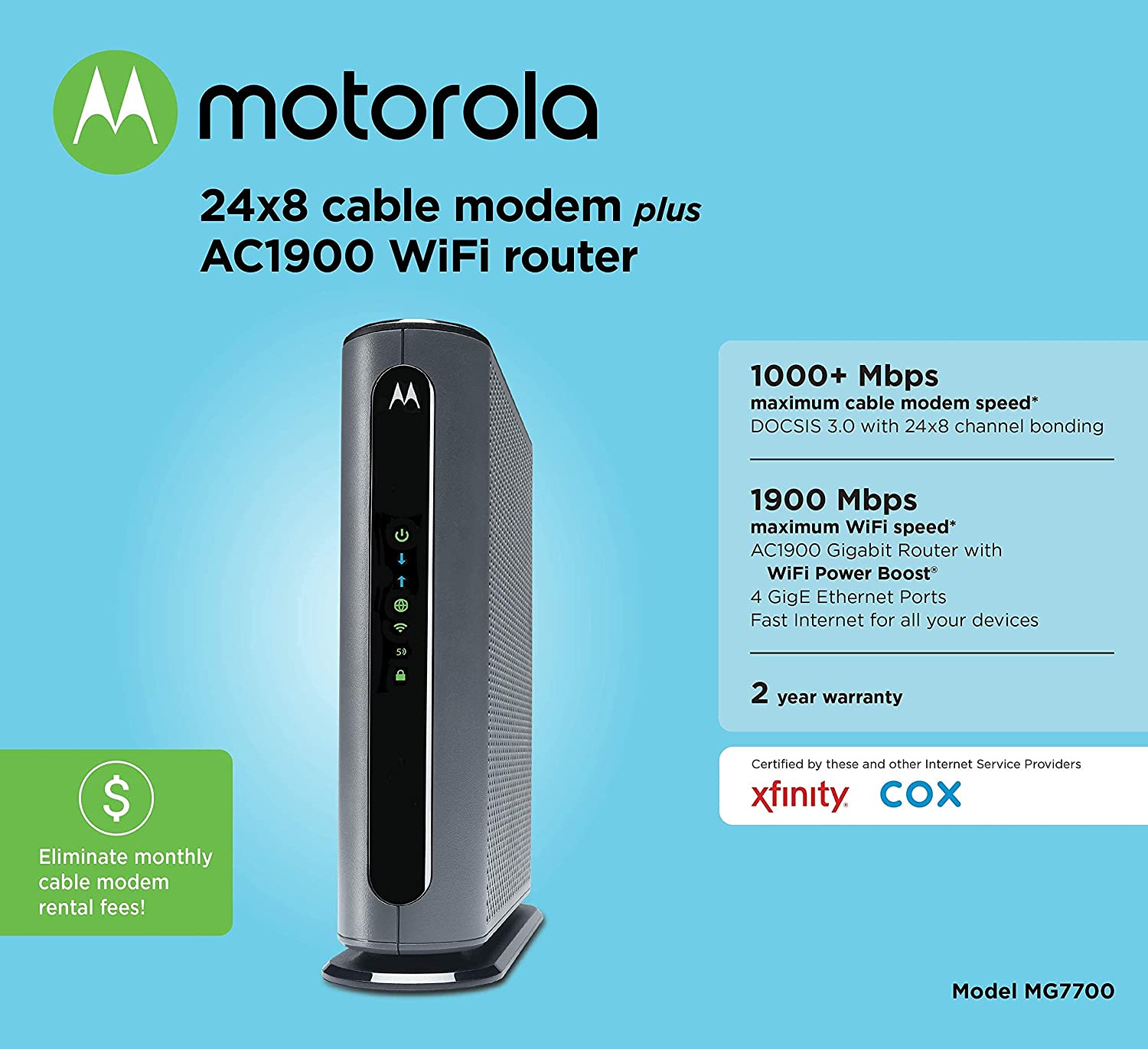 • Eliminate up to 156 dollars per year in cable Modem rental fees. (Savings are shown for Comcast Xfinity and vary by cable service provider.) certified by all leading cable service providers including Comcast Xfinity, Cox, Charter spectrum (no cable Modem is compatible with fiber optic, DSL, or satellite services, available from Verizon, AT&T, CenturyLink, Frontier, and others.)