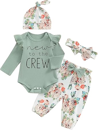 Newborn Baby Girl Clothes Outfits New To The Crew Bodysuit Romper Floral Pants Headband Hat Coming Home Outfit
