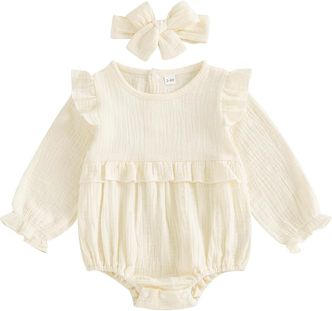 Newborn Infant Baby Girl Clothes Cotton Linen Long Sleeve Smocked Bubble Romper Ruffle Bodysuit Jumpsuit Fall Outfit