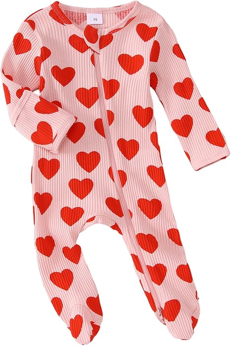 Newborn Infant Baby Girls Valentine's Day Romper Long Sleeve Bodysuit Cute Heart Print Ribbed Onesie Jumpsuit