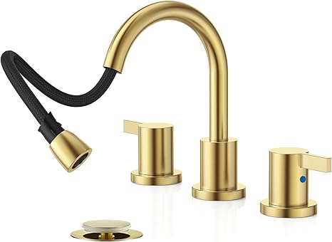 Phiestina Pull Down Sprayer Brushed Gold Bathroom Sink Faucet, 8 Inch 3 Hole 2 Handles Widespread Pull Out Bathroom Faucet´_‘with Metal Pop-Up Drain and Water Supply Line´_‘BF04012-K01-BG