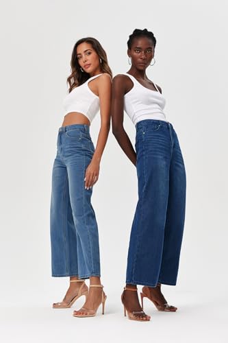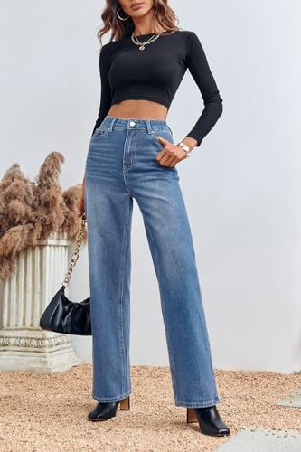 PLNOTME Women's High Waisted Wide Leg Jeans Loose Stretchy Boyfriend Mom Denim Pants Light Blue