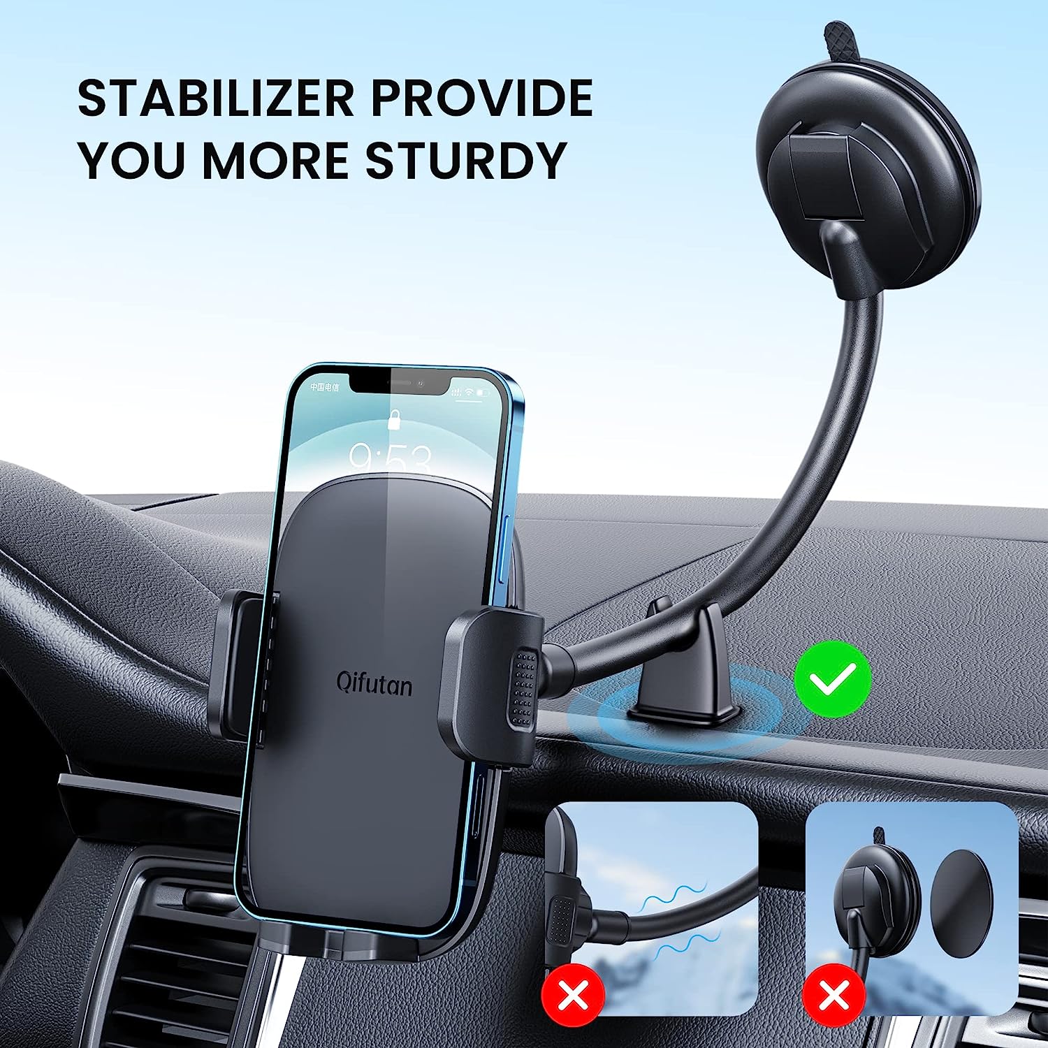 Qifutan Cell Phone Holder for Car Phone Mount Long Arm Dashboard Windshield Car Phone Holder Strong Suction Anti-Shake Stabilizer Phone Car Holder Compatible with All Phone Android Smartphone