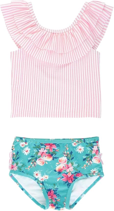 RuffleButts Girls UPF50+ Sun Protection One Shoulder Ruffle Tankini Two Piece Swimsuit