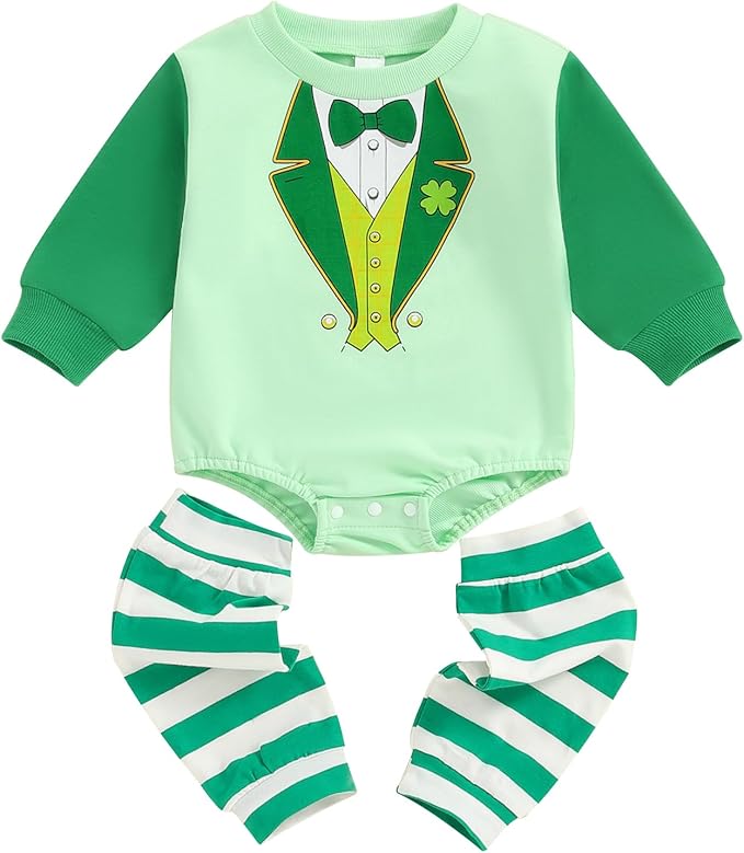 Saint Patricks Day Baby Boy Funny Graphic Romper Cartoon Tie Suit Green Striped Leg Warmers Spring Clothes Set