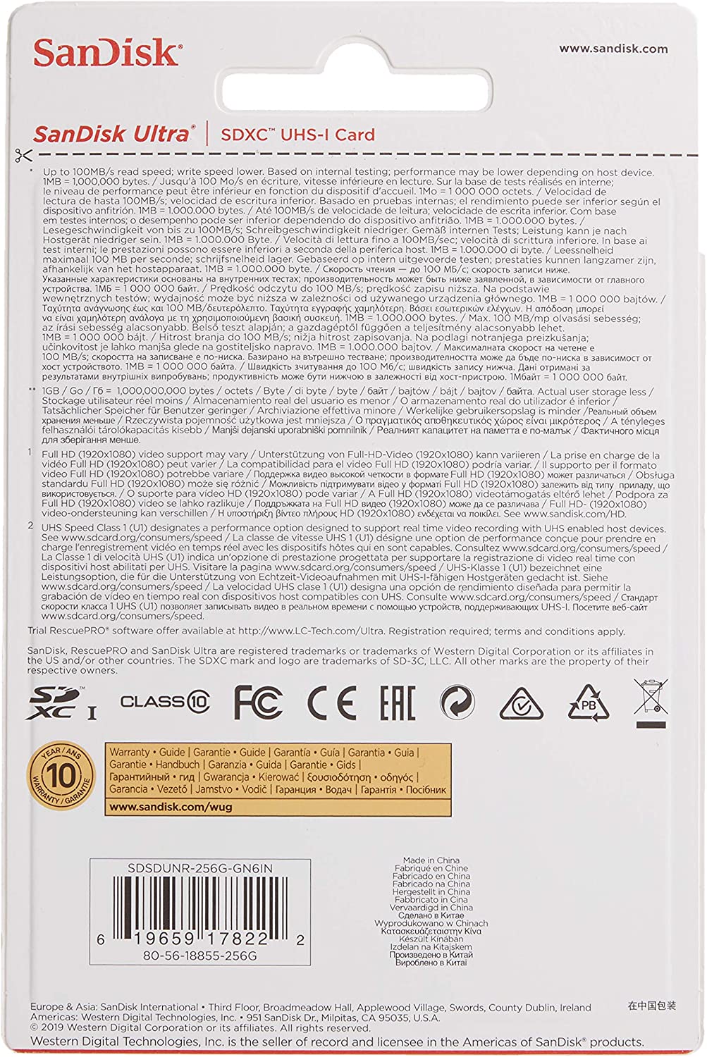 Take better pictures and Full HD videos (2) with your compact to mid-range point-and-shoot cameras and camcorders. With SanDisk Ultra UHS-I cards, you’ll benefit from faster downloads, higher capacity and better performance to capture and store 32GB to 256GB of high-quality pictures and Full HD video (2). Take advantage of ultra-fast read speeds of up to 100MB/s [64GB-256GB; 90MB/s for 32GB] to save time moving photos and videos from the card to your computer. SanDisk Ultra UHS-I cards are water-proof, temperature-proof, X-ray proof, shockproof, compatible with SDHC and SDXC digital devices, and comes with a 10-year limited warranty. Note: Not all devices support SDXC memory card formats. Check with your device manufacturer for more details. Up to 100MB/s [64GB-256GB; 90MB/s for 32GB] read speed; write speed lower. Based on internal testing; performance may be lower depending on host device, usage conditions, and other factors. 1MB=1,000,000 bytes. (1)1GB=1,000,000,000 bytes. Actual user storage less. (2) Full HD (1920x1080) video support may vary based upon host device, file attributes, and other factors. (3) See official SanDisk website for more details regarding warranty in your region. (4) Card only. See product packaging and official SanDisk website for additional information and limitations. (5) UHS Speed Class 1 (U1) designates a performance option designed to support real time video recording with UHS enabled host devices. See official SanDisk website for additional information and limitations. SanDisk, the SanDisk logo, and SanDisk Ultra are registered trademarks or trademarks of Western Digital Corporation or its affiliates in the US and/or other countries. The SD, SDHC, and SDXC marks and logos are trademarks of SD-3C, LLC. All other marks are the property of their respective owners. Copyright 2019 Western Digital Corporation or its affiliates. All rights reserved.