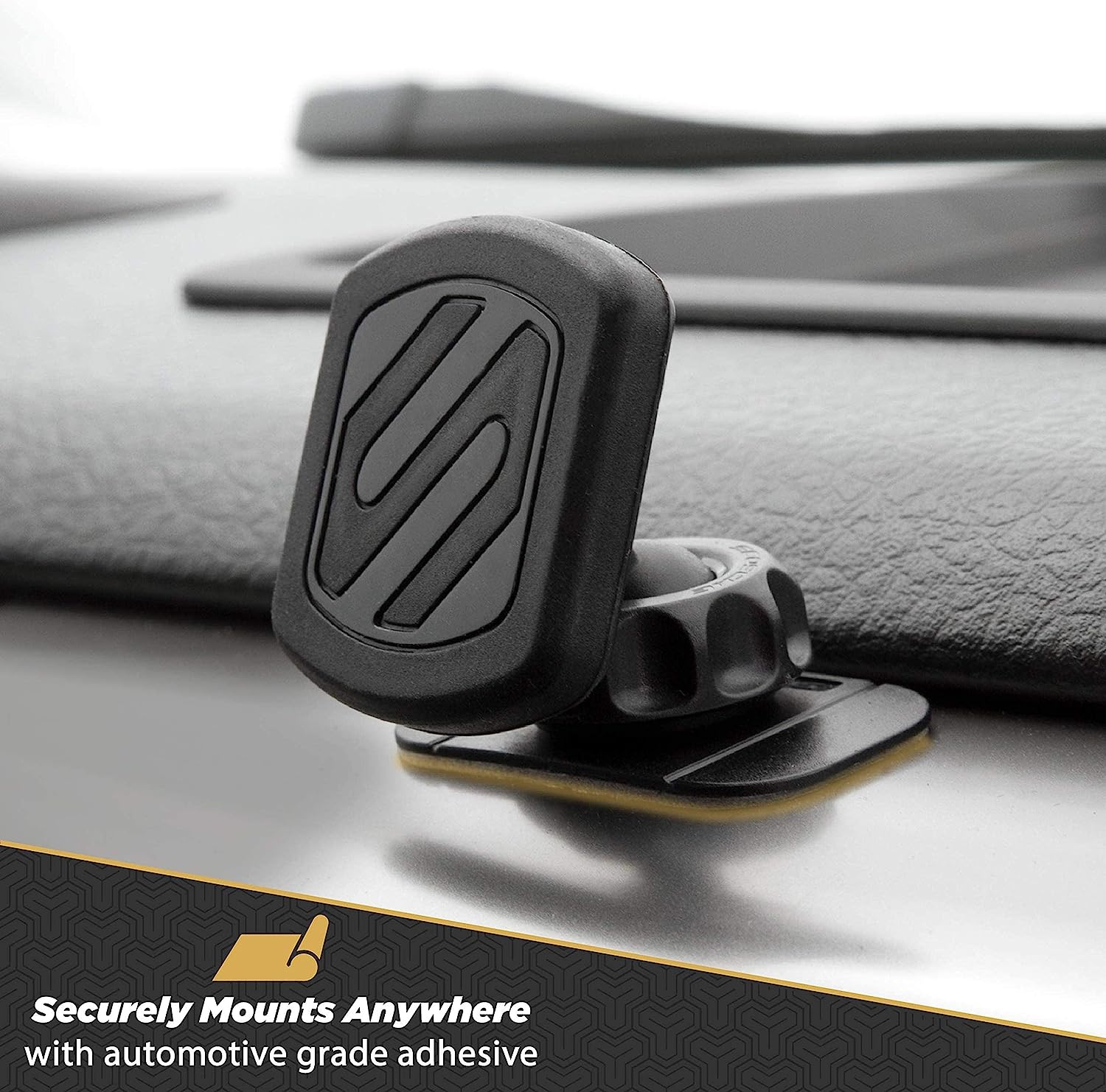 Quick, Convenient and Hands-Free; the MagicMount is a powerful car phone mount magnetic system for conveniently mounting your smartphone, cell phone or larger smart devices to the dashboard in your vehicle, office, workshop, boat or RV. Lock your cell phone or device in place with this Scosche dash mount car holder featuring a 4-Axis adjustable ball joint neck with lock for optimal viewing at any angle. The integrated cable clips let you neatly connect your cables to the back of the magnetic phone car mount to keep cables from obstructing your view. Its cradle-free design eliminates the need to tighten around your device, just hover your phone magnet near the phone magnetic mount surface and it instantly locks securely in place. These powerful N50 neodymium magnets are very strong magnetic car phone mounts and are still 100% safe for modern smartphones and devices. The low-profile mount safely attaches to your dashboard using the automotive grade base to ensure optimal holding power. Compliment your cell phone automobile accessories with this car phone holder.