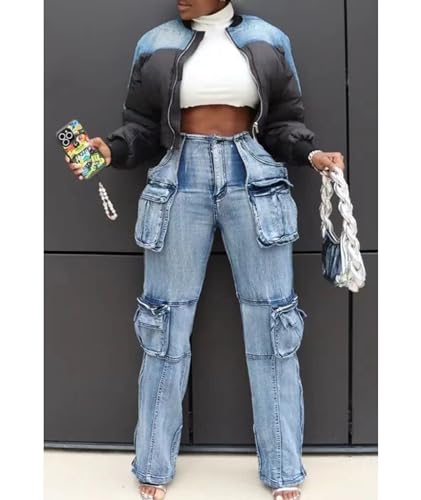 Sexyshine Women's High Waist Multi-Pocket Cargo Jeans Y2K Straight Leg Long Stretch Denim Pants Chic Club Streetwear(26596BE,XL)
