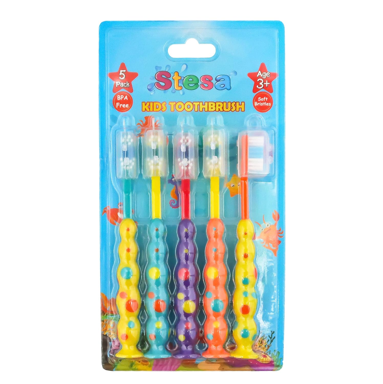 Stesa Manual Kids Toothbrush - 5 Pack - Soft Bristles, BPA Free, Suction Cup for Fun Storage, Dust Covers Included - Boys and Girls Toddler Toothbrush - Age 3+, Yellow