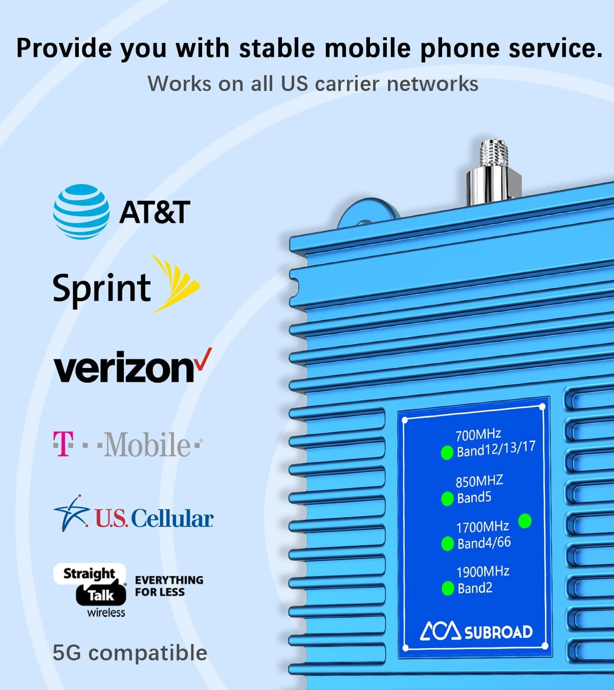 • The Cell Phone Signal Booster by Subroad increases voice, text, and 5G 4G LTE data for all North American cell carriers, including AT&T, Verizon, Sprint and T-Mobile & more. It greatly enhances 5G 4G, LTE, 3G and 2G cell service for all your wireless devices (smartphones, notebooks, hotspots, etc.). Furthermore, it works regardless of phone model (iPhone, Android, Samsung Galaxy, etc)