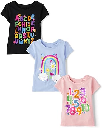 The Children's Place, And Toddler Girls Short Sleeve Graphic T-shirt 3-pack, Baby-Girls, Alaphabet/Numbers/Over the Rainbow, 4T