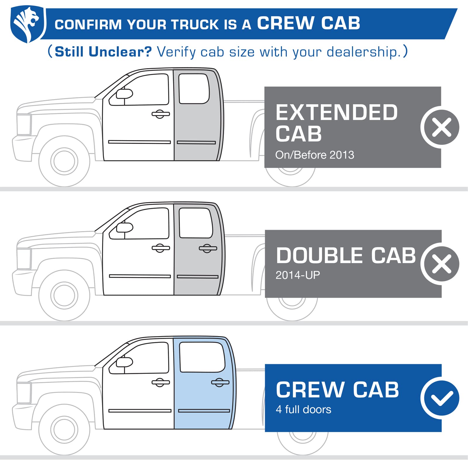 • FITMENT - Compatible with 2007-2018 Chevy Silverado/GMC Sierra 1500; 2007-2019 2500 HD 3500 HD; 2019 Silverado 1500 LD / Sierra 1500 Limited | Crew Cab [Cab Size Note: Only fit Crew Cab with 4 full-size doors. (See Image for more info)] | Will not fit Classic Body Style