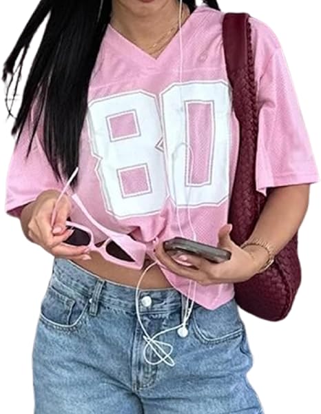 Women Y2k Jersey Shirts Short Sleeve V-Neck Number Oversized Soccer Jersey Tee Tops Sportswear