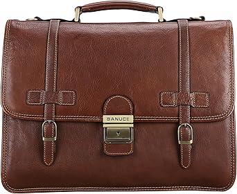 Banuce Vintage Genuine Full Grain Italian Leather Briefcase for Men with Lock 14 Inch Laptop Bag Professional Business Work Bag Attache Case with Luggage Strap Brown