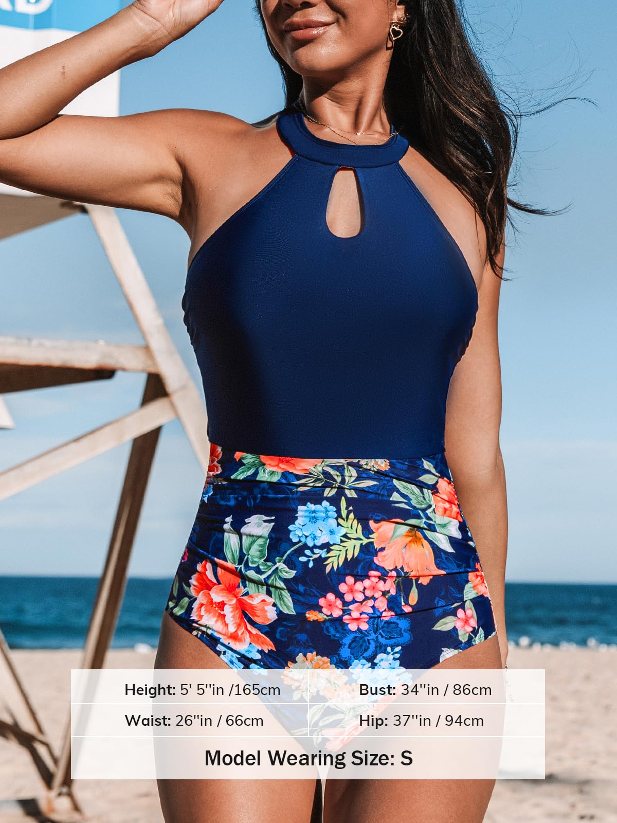 • Design: This One Piece Swimsuit Features a High Neck with Keyhole and Halter Style for Sophisticated Charm. Enhanced with Ruched Detailing and Power Mesh Tummy Control for a Smooth Fit. A Back Cutout Offers a Flirty Touch. Cup: Removable Soft Cups.
