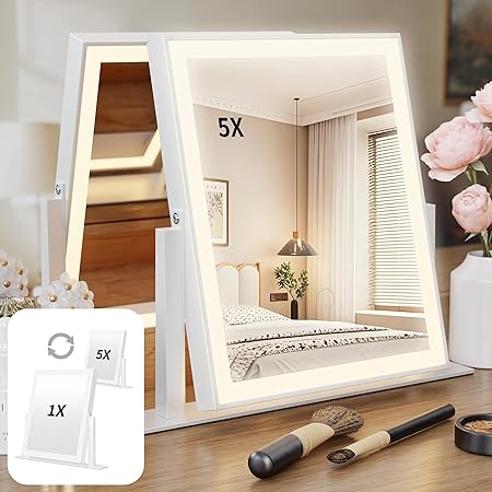 Double Sided Hollywood Vanity Mirror with 1x/5x Magnification and Lights, Rechargeable 10"x12" Lighted Magnifying Makeup Mirror with 3 Color Lighting, Brightness Adjustable, 360ë� Rotation, Gift for Women