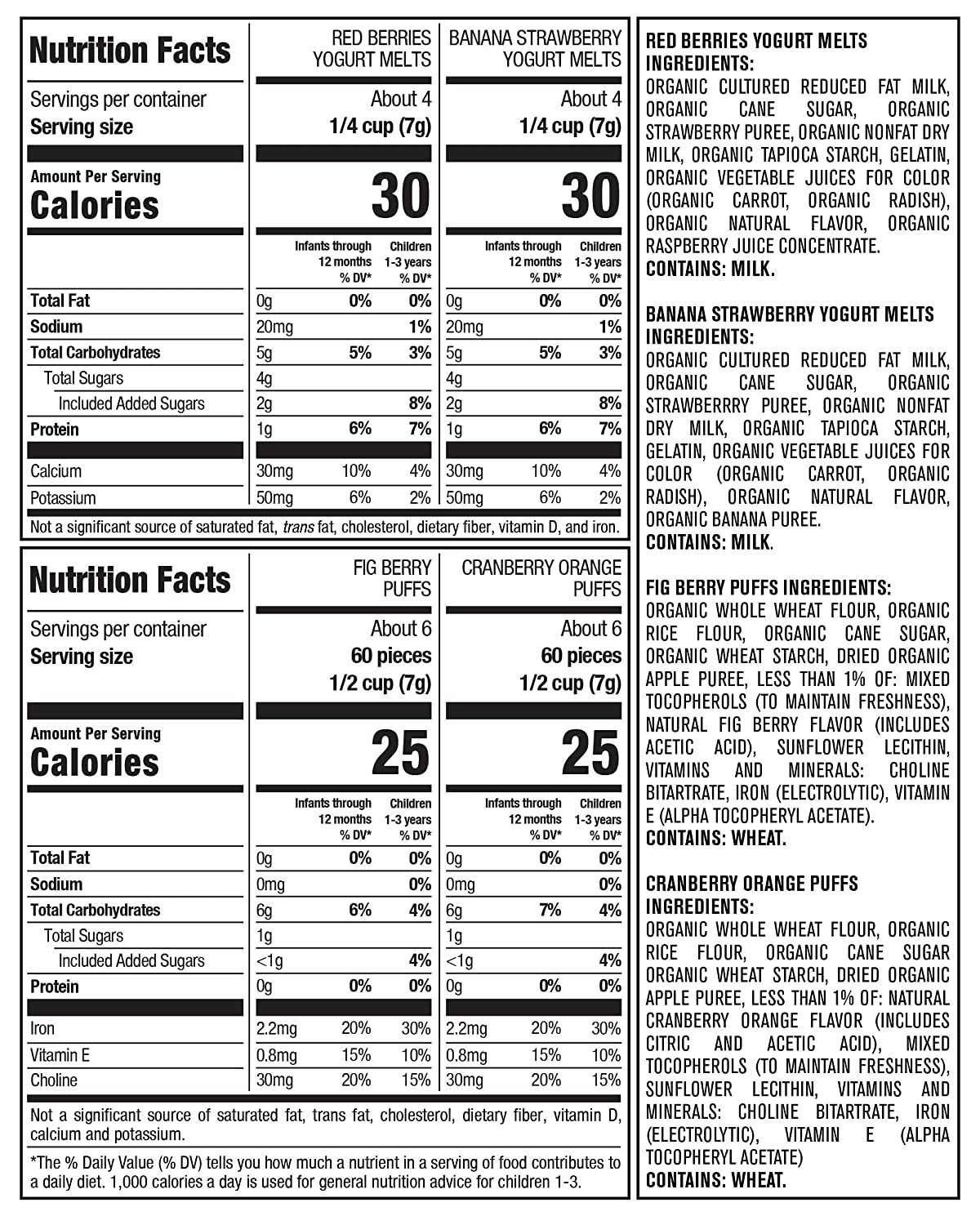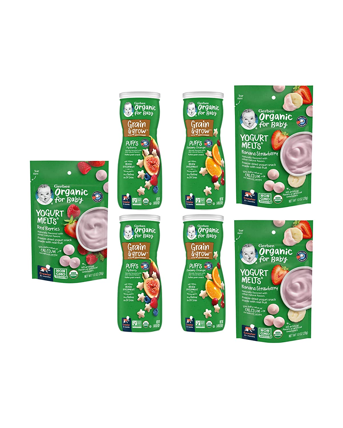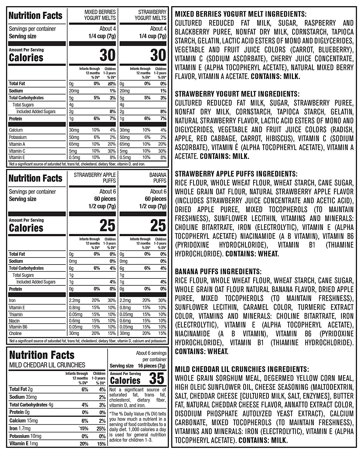 • Variety pack: This 9Count variety pack, contains 3-1.48 ounce mild Cheddar Lil Crunchies, 2-1.48 ounce strawberry apple puffs, 1-1.48 ounce banana puffs, 2-1 ounce strawberry yogurt melts and 1-1 ounce mixed berry yogurt melts