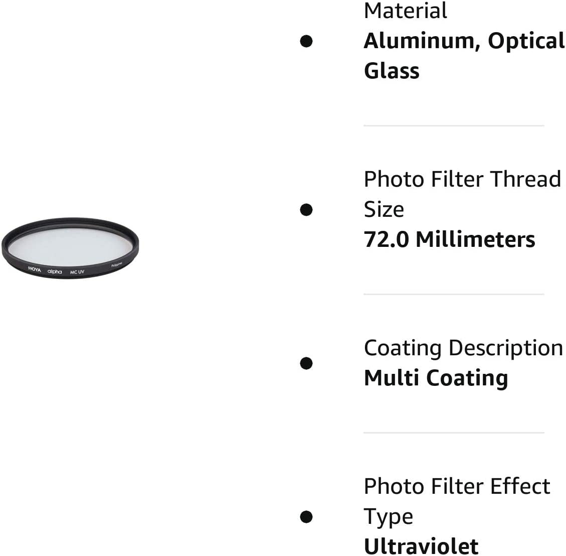 The Hoya 55mm Alpha MC UV Filter absorbs ultraviolet rays and can be left on the lens at all times for protection. The filter is multi-coated (MC) to reduce ghosting, flare and reflections. Features high-quality optical glass and a durable aluminum frame.