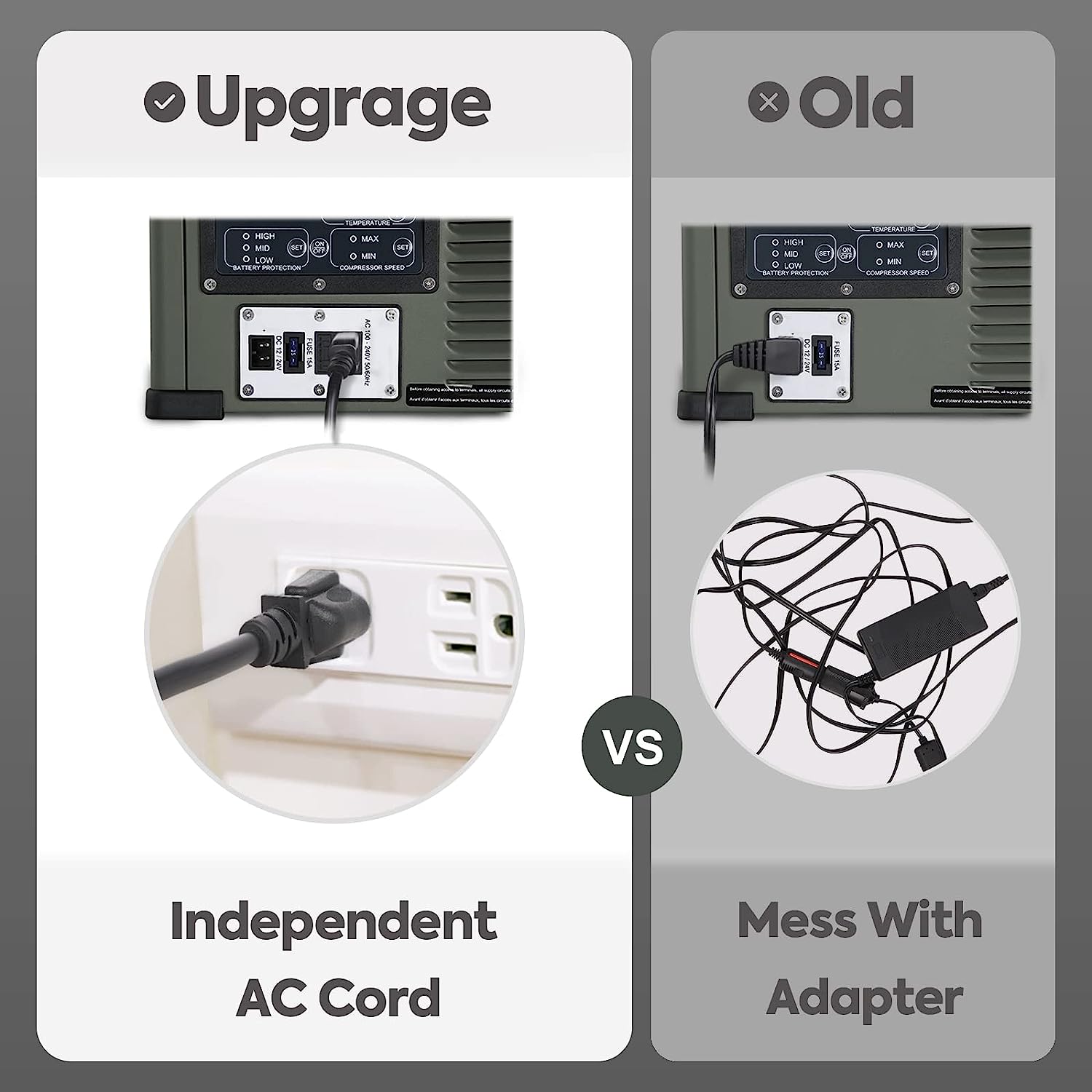• ※ 【Car and Home Use】 - Each portable refrigerator is equipped with a DC cord and an AC cable. Independent 12V/24V DC and 110-240V AC output port avoid chaotic wire accumulation and make the use environment cleaner and safer.