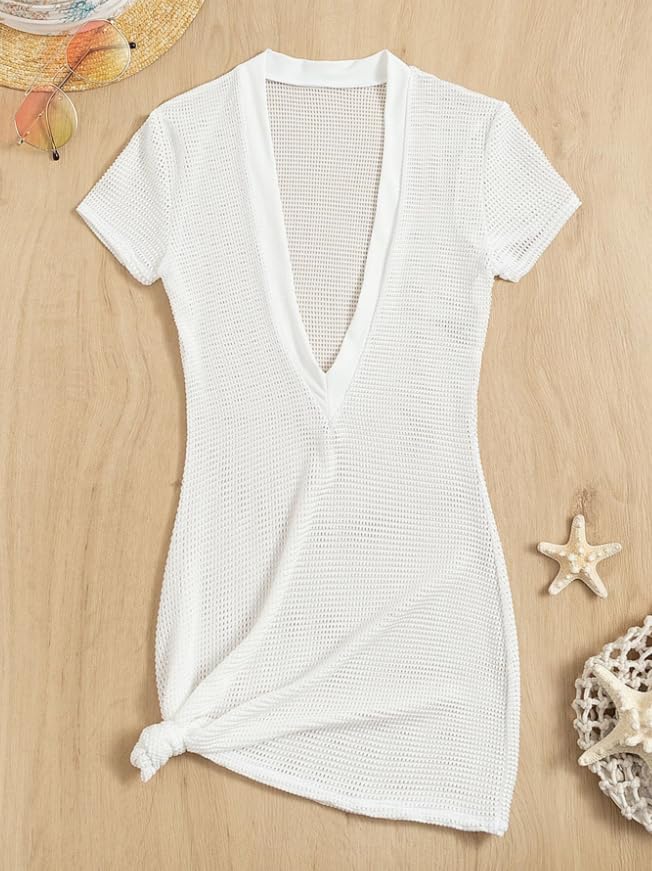 Lilosy Sexy V Neck Short Sleeve Fishnet Beach Swim Cover Up Dress String Tie Side Cheekly Thong Triangle Bikini Crochet Sheer Swimsuit Women Bathing Suit Set 3 Piece White Medium
