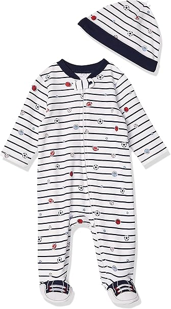 Little Me Baby Boys 100% Cotton Scratch Free Tag 2-piece Sleeper Footie And Cap Set, Sports Star, Newborn US