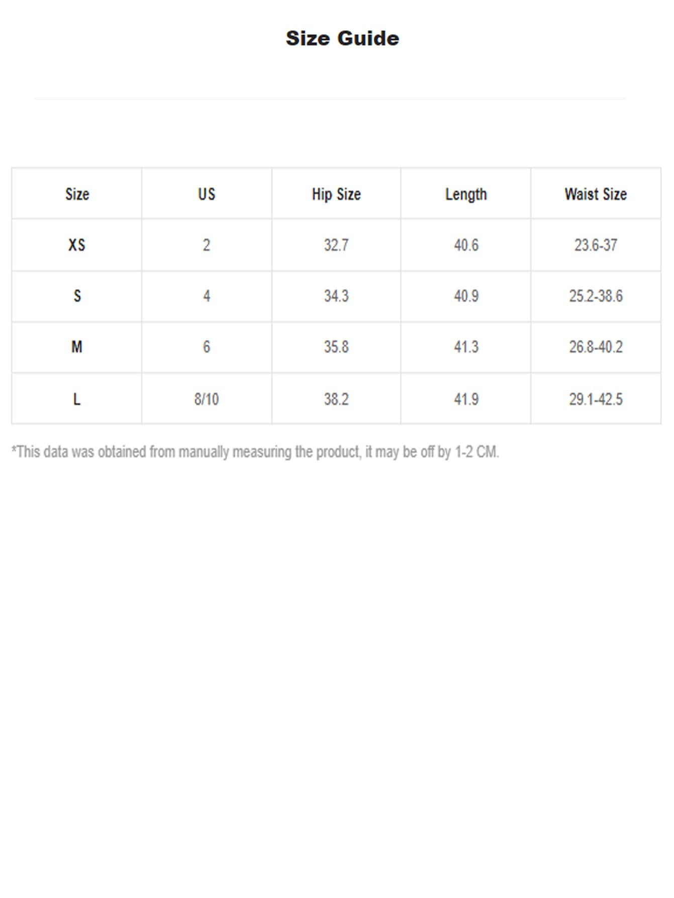 Large: Hip Size: 38.2", Length: 41.9", Waist Size: 29.1-42.5"