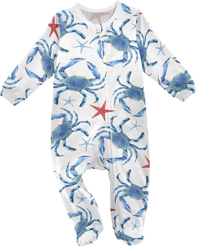 Pfrewn Baby One-Piece Footies Watercolor Blue Crabs Starfish Long Sleeve Sleep and Play Boys Girls Zip Front Romper Jumpsuit 6M