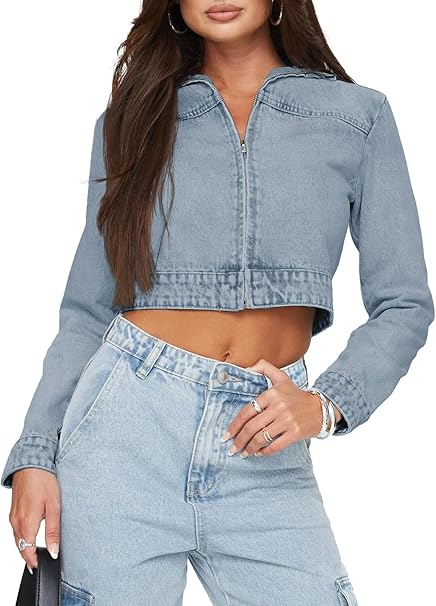 PLNOTME Womens Cropped Denim Jackets Casual Long Sleeve Zipper Lapel Collar Crop Jean Jackets