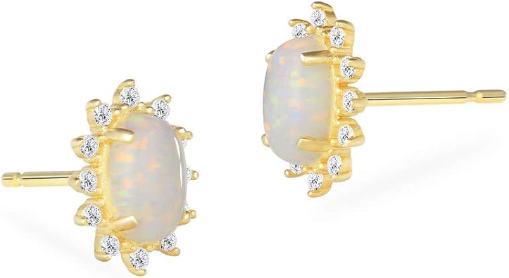 Real 14K Yellow Gold Created Opal CZ Accent Flower Style Oval Stud Earrings