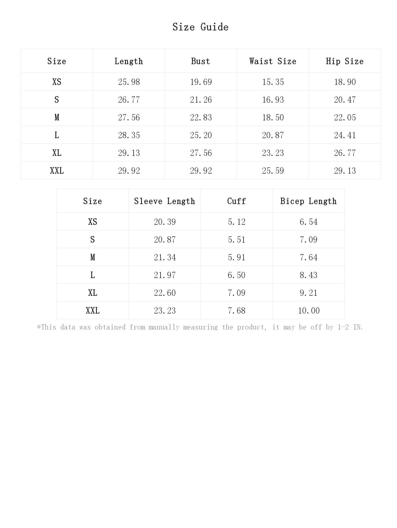 Large: Bicep Length: 8.4", Bust: 25.2", Cuff: 6.5", Hip Size: 24.4", Length: 28.3", Sleeve Length: 22.0", Waist Size: 20.9"