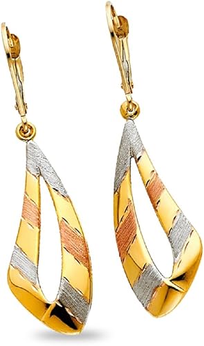 Solid 14k Yellow White Rose Gold Curve Drop Dangle Earrings Leverback Genuine Tri Color 45 x 12 mm